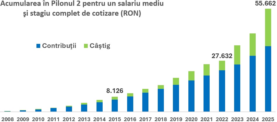 Cu titlu de exemplu, un român care câștigă salariul mediu și a contribuit la Pilonul 2 în fiecare lună de la început și până în prezent are în contul personal o sumă totală de cca. 55.662 RON, din care 64% sunt contribuțiile virate și 36% câștigul adăugat în timp de randamentele investiționale. Această sumă s-a dublat în ultimii 3 ani și este de aproape 7 ori mai mare decât în urmă cu 10 ani. Estimările APAPR arată că deja 1,1 milioane de români au în conturile personale de Pilon 2 sume de peste 50.000 de lei.