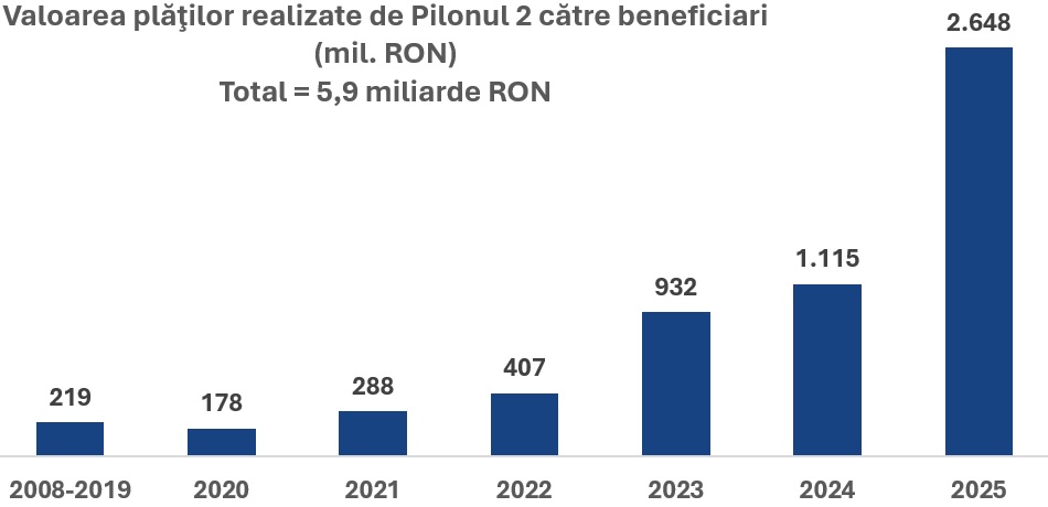 Fondurile de pensii din Pilonul 2 au realizat deja un număr de 300.000 de plăţi către beneficiari (participanți și moștenitori), sumele plătite fiind în valoare totală de 5,9 miliarde de lei în perioada 2008-2025. Doar în 2025, sumele plătite au fost de 2,65 miliarde de lei (mai mult decât dublu față de 2024), către 88.000 de beneficiari.