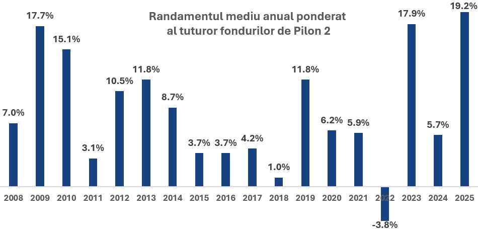 Cele 7 fonduri de pensii private obligatorii (Pilonul 2) au obținut în 2025 un randament mediu de 19,2%, cel mai bun rezultat anual din istoria de aproape 18 ani a sistemului, potrivit calculelor Asociației pentru Pensiile Administrate Privat din România (APAPR) prezentate pe pilonul2.ro.