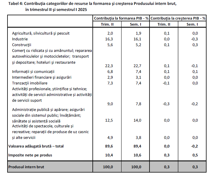 La creşterea PIB, în semestrul I 2025 faţă de semestrul I 2024, contribuții pozitive au avut următoarele activități economice: