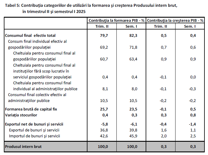 Produsul intern brut (PIB) a crescut în primul semestru din 2025 cu 0,3%, pe serie brută, comparativ cu perioada similară din 2024 şi cu 1,4% pe seria ajustată sezonier, arată datele provizorii (1) publicate vineri de Institutul Naţional de Statistică (INS).