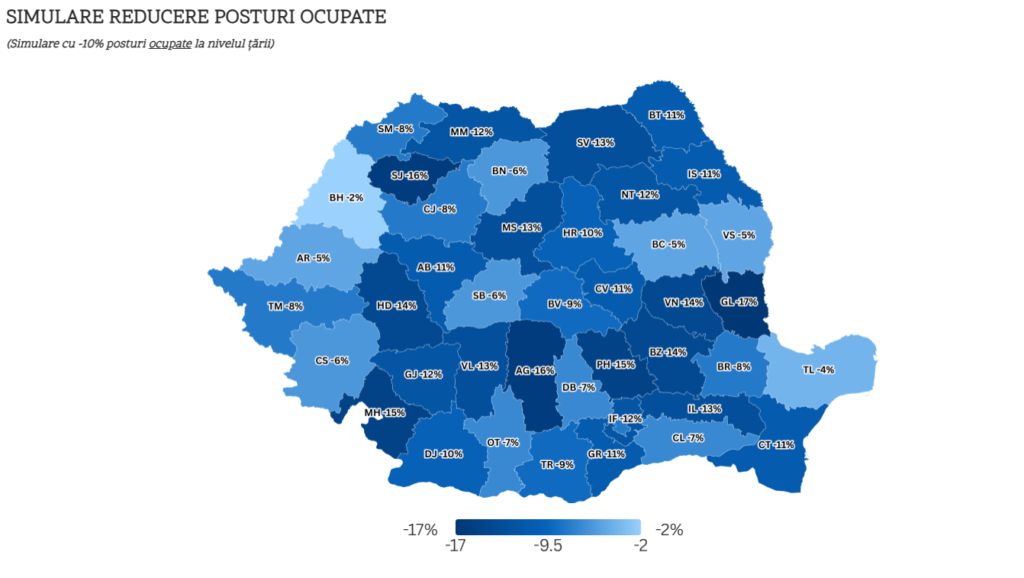 Conform datelor publicate de Guvern, printre județele cele mai afectate de reduceri de numără: Prahova: -724 posturi, București: -709 posturi, Argeș: -649 posturi, Suceava: -627, Galați: -522 posturi.